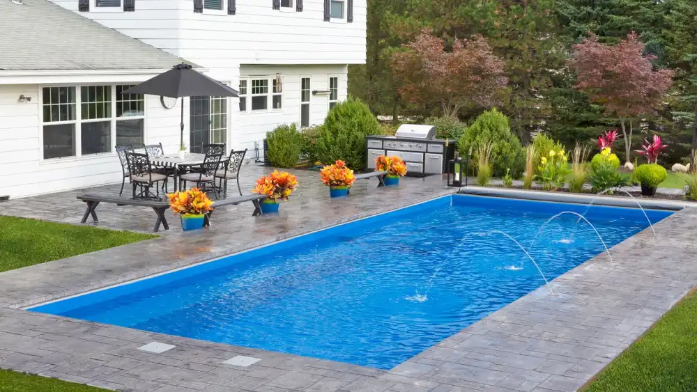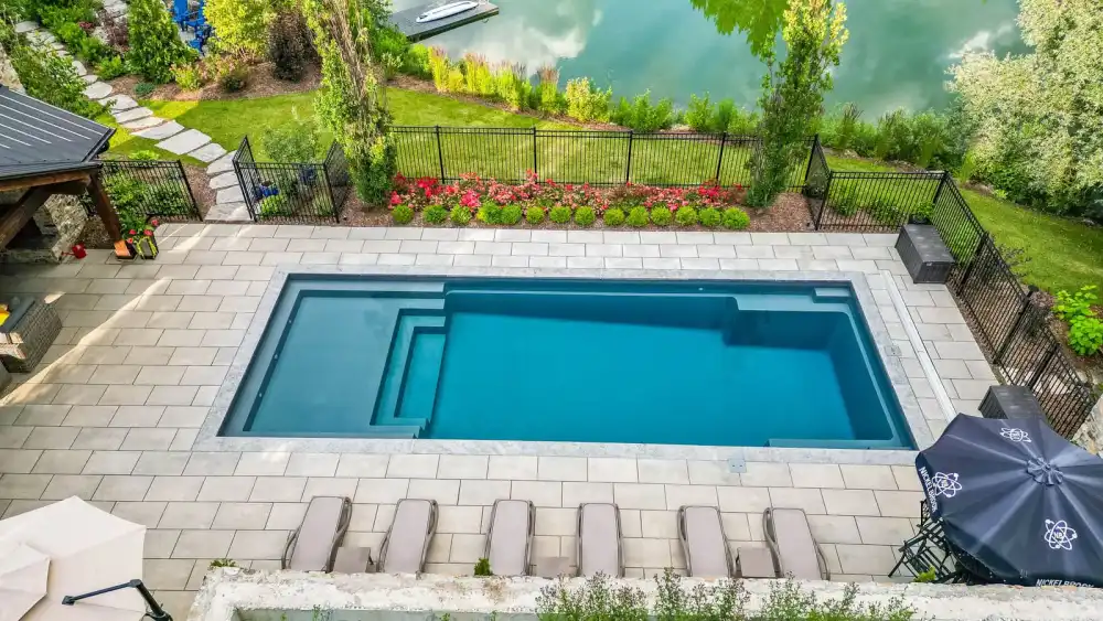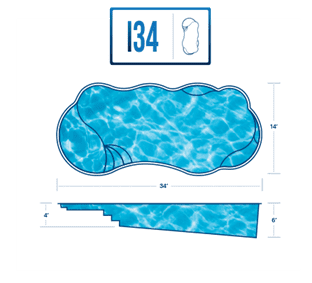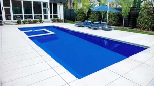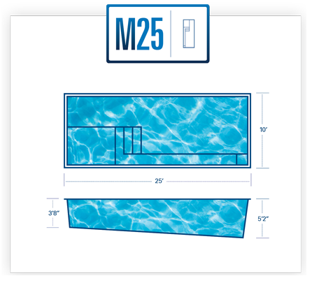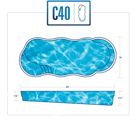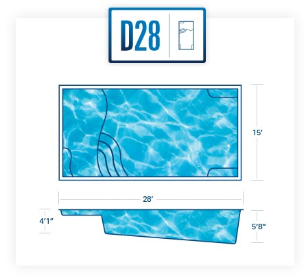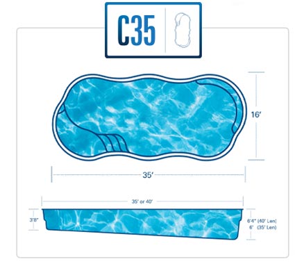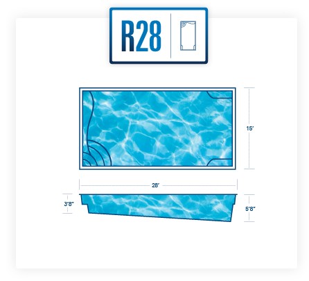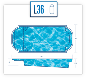 A remarkable pool that can provide luxury and grace in limited backyards With four length options (starting at 16 feet and ending at 26 feet,) it offers a full width bench (10 feet) at the entry area and a generous swimming area inside it. This pool is often complimented with generous greenery and landscaping along with the potential for tile along the sides of the pool for a unique, stylish look.