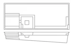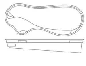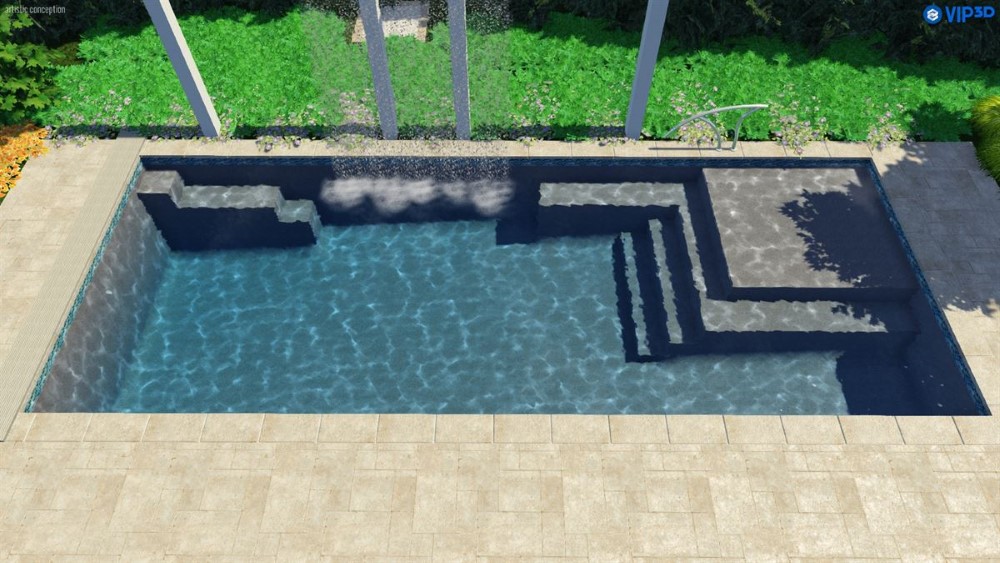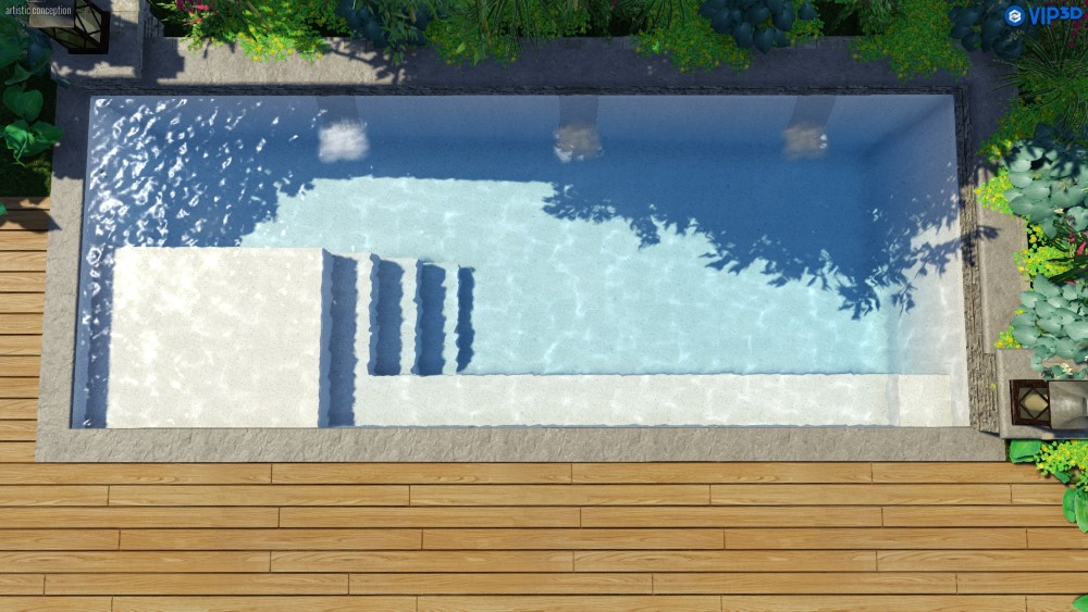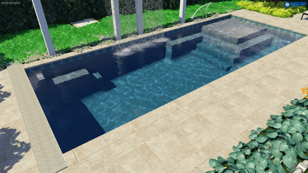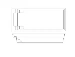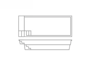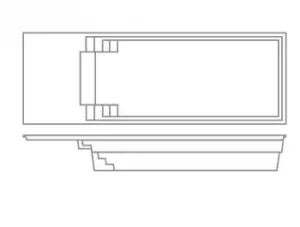 A flat-bottom pool that is perfect for group play activities and to fulfill exercise goals. A full bench is situated at the front of the pool coupled with entry stairs along both sides of the pool. This pool allows for the placement of spa jets around it or even a full swim jet package.